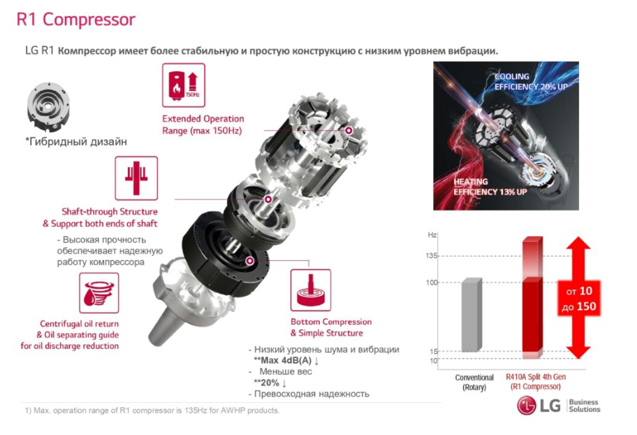Компрессор наружного блока, как и сам блок LG Therma V четвертого поколения, изготавливается в Корее на собственных производственных мощностях торговой марки LG.
