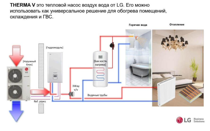 THERMA V это тепловой насос воздух вода от LG. Его можно использовать как универсальное решение для обогрева помещений, охлаждения и ГВС.
